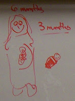 How long does a baby grow before it can be born? Nine months! Yes. In Luke's Gospel, which I'm reading from, it says, "And in the sixth month," that's when Elizabeth was 6 months pregnant with John [I draw & talk] here she is, she's happy...and here's John upside down in her tummy...