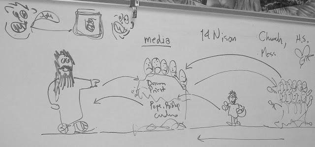 Partial board from the Jan 25, 2012 class. Lesson plan runs from Feeding the Multitudes to the Bread of Life Discourse, to Simon's name-change to Peter.